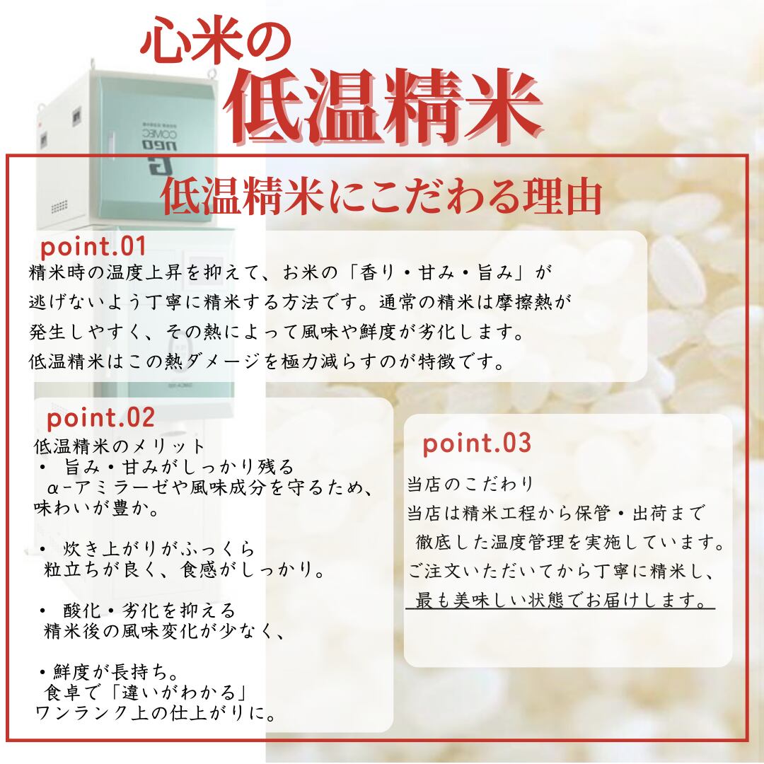 ・玄米の状態で温度を一定に保てる低温の倉庫で保存しており食味を一年間保っていますのでご安心ください